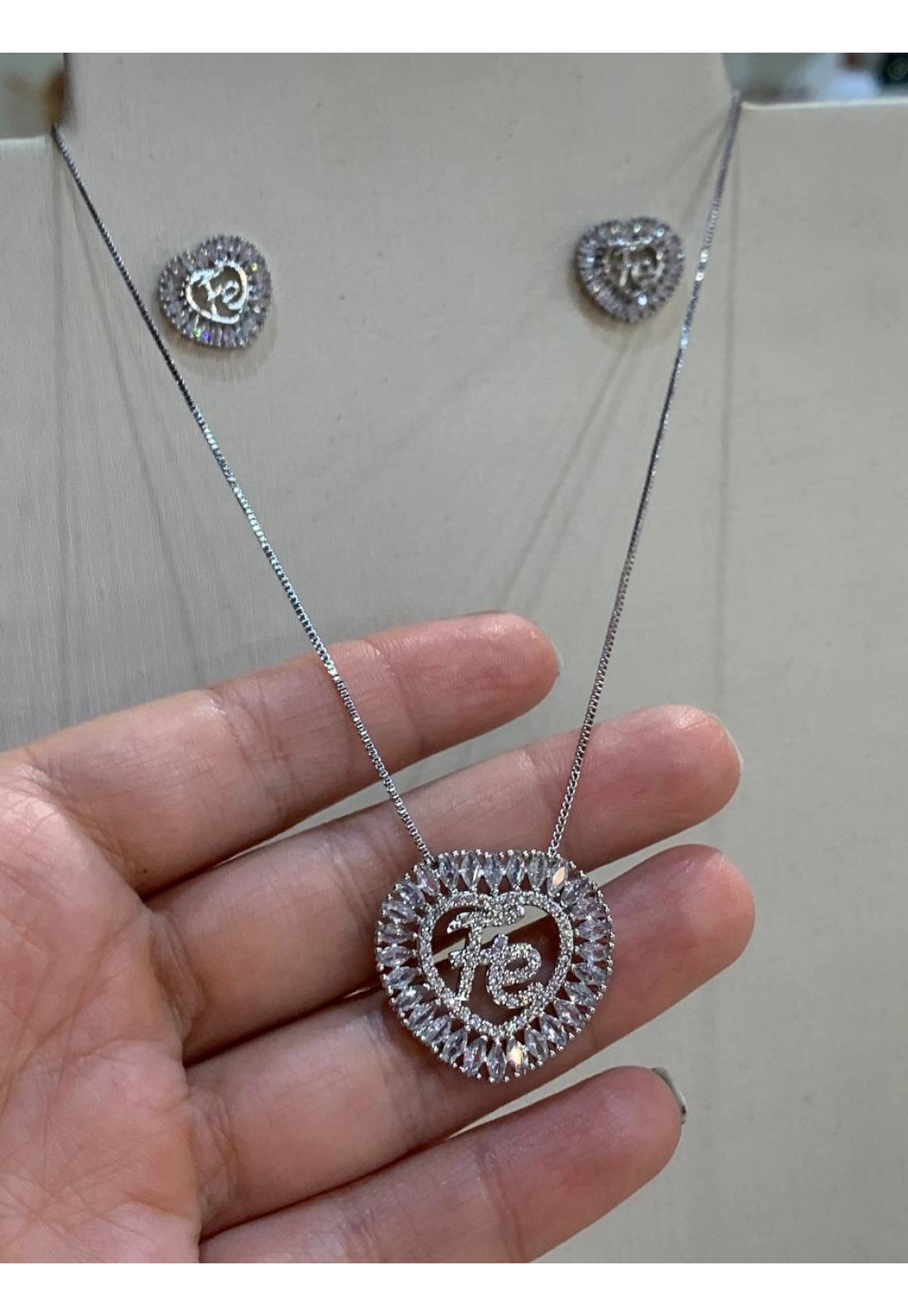 • Modelo: CONJUNTO Coração em baguete escrita Fé em Zirconias Ródio Branco