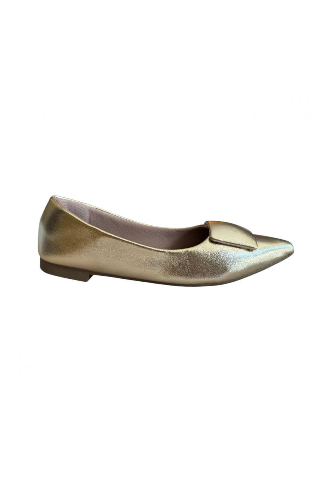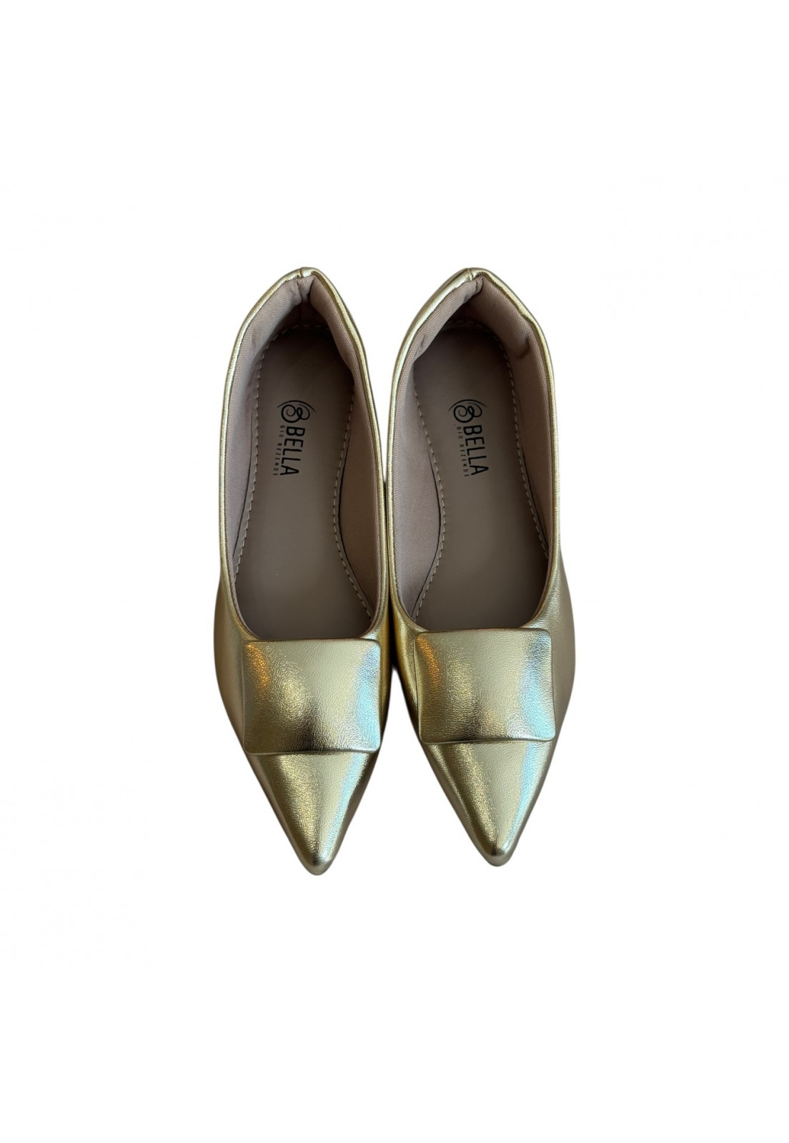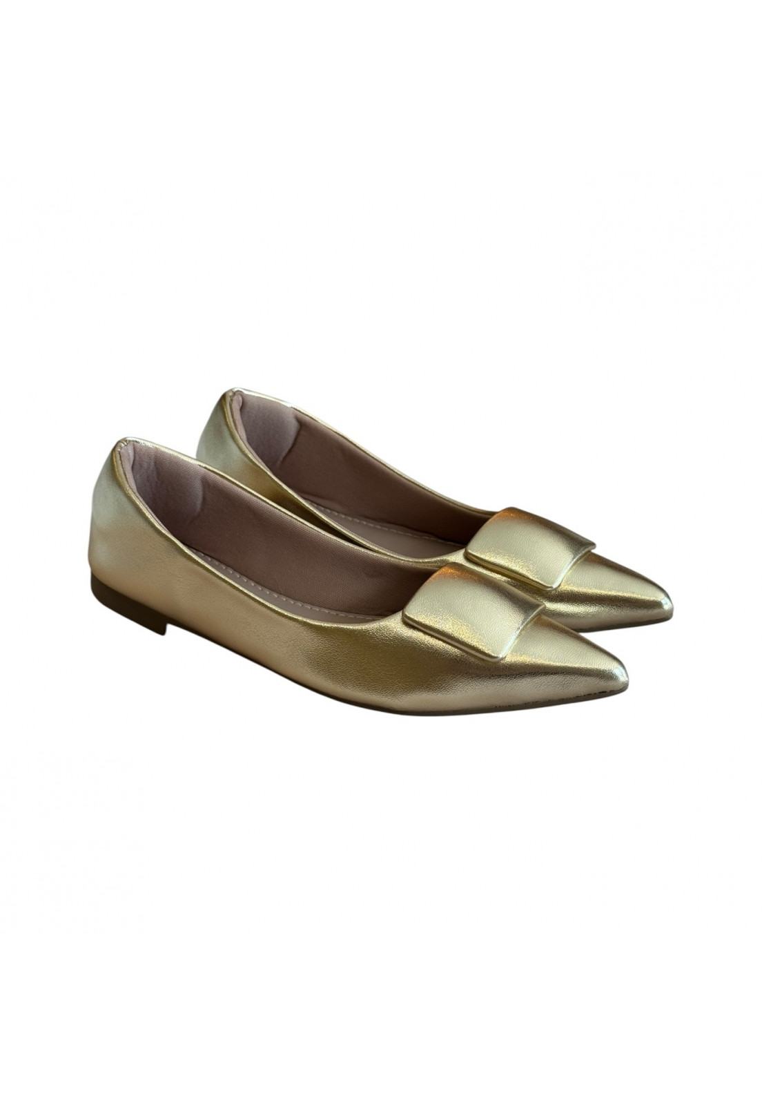 O modelo tem salto rasteiro, base emborrachada e bico fino.