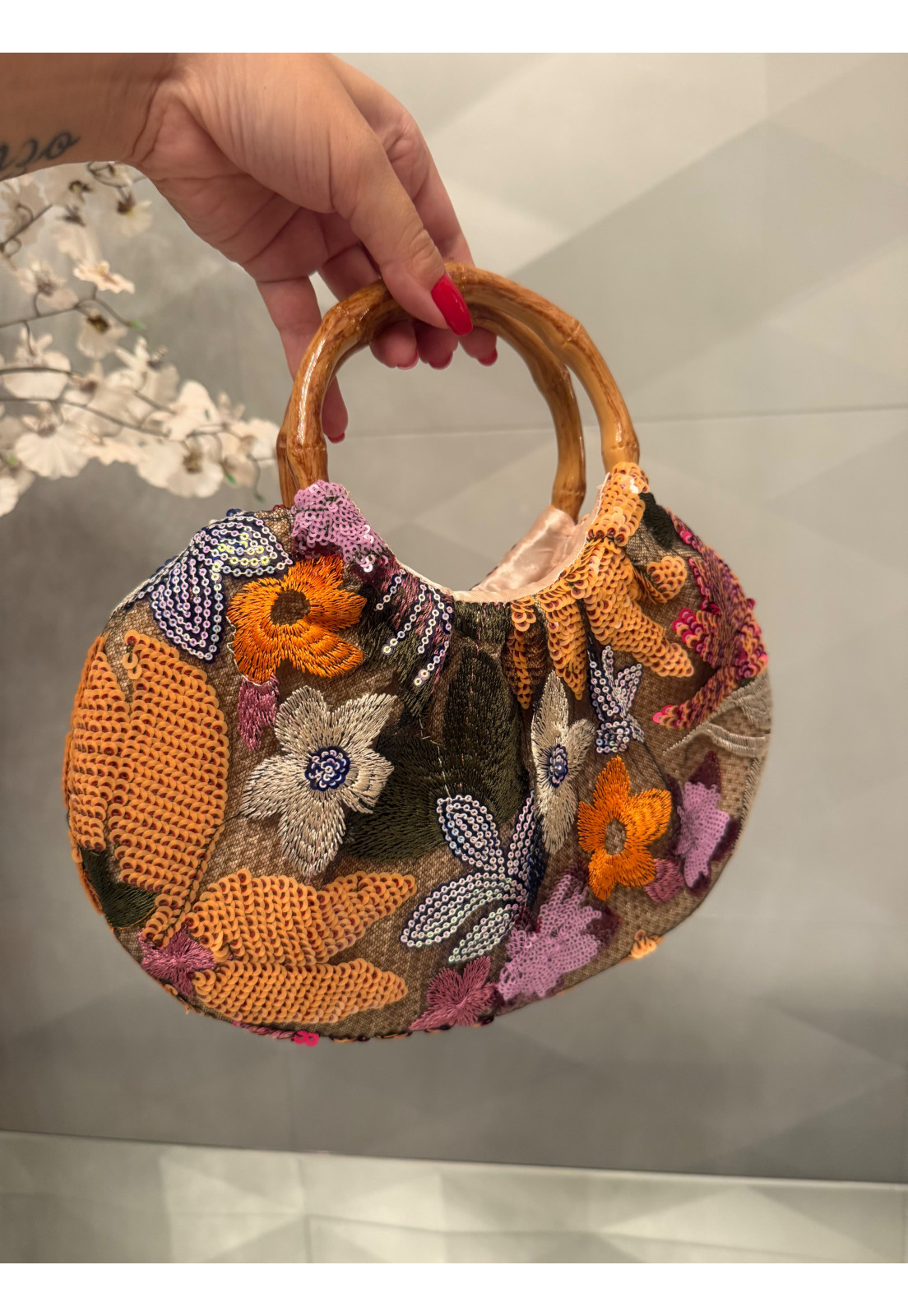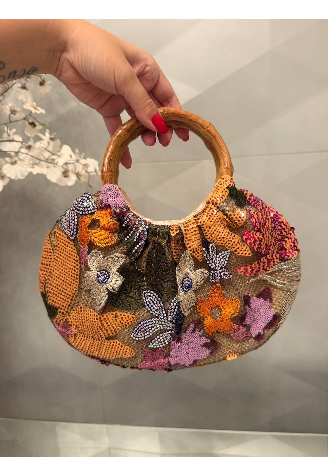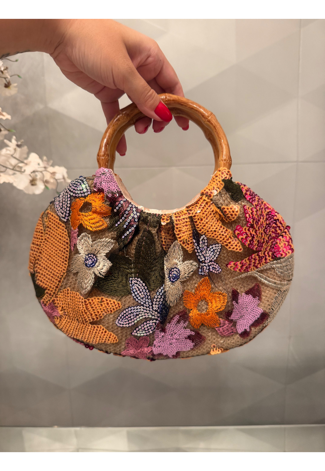 Exclusividade e Estilo Uma peça única que traduz personalidade e sofisticação em cada detalhe. Com bordados ricos em tons de laranja e aplicações de paetês delicados, essa bolsa traz um visual artístico e elegante, perfeito para quem busca sair do óbvio. O destaque fica por conta da alça rígida com efeito bambu, que adiciona um toque natural e contemporâneo, criando um contraste sofisticado com o brilho sutil dos bordados. O laço frontal em paetês valoriza ainda mais o design, tornando a peça ainda mais especial. Bordados e paetês com acabamento premium Design exclusivo e cheio de personalidade Alça com efeito bambu elegante e moderna Ideal para looks sofisticados, eventos e produções estilosas Perfeita para mulheres que amam peças únicas e querem expressar estilo com autenticidade.