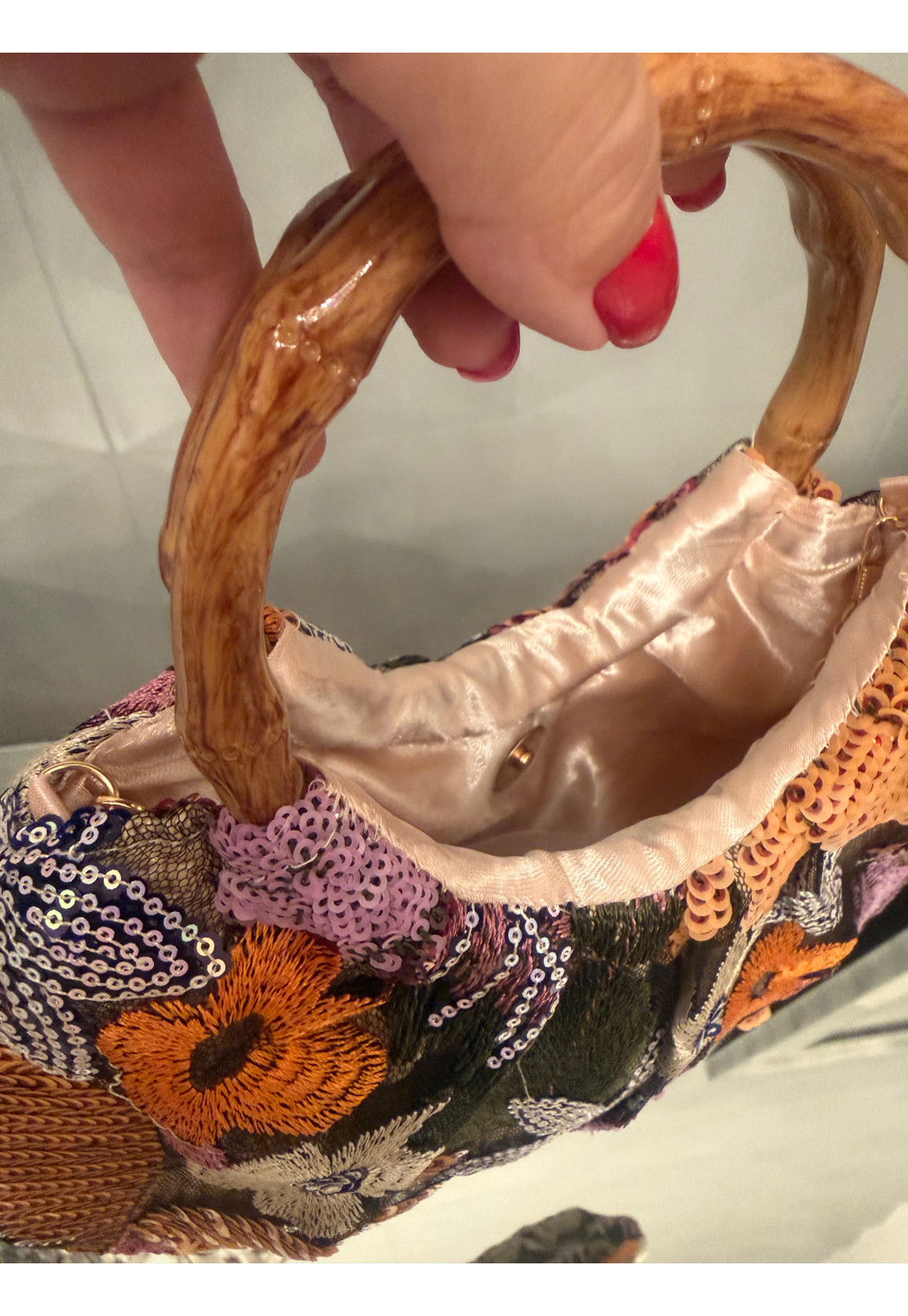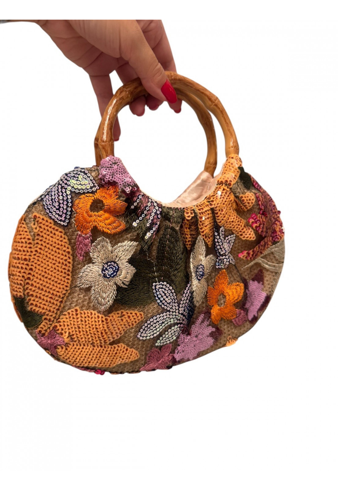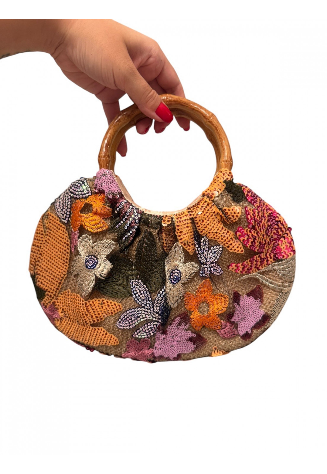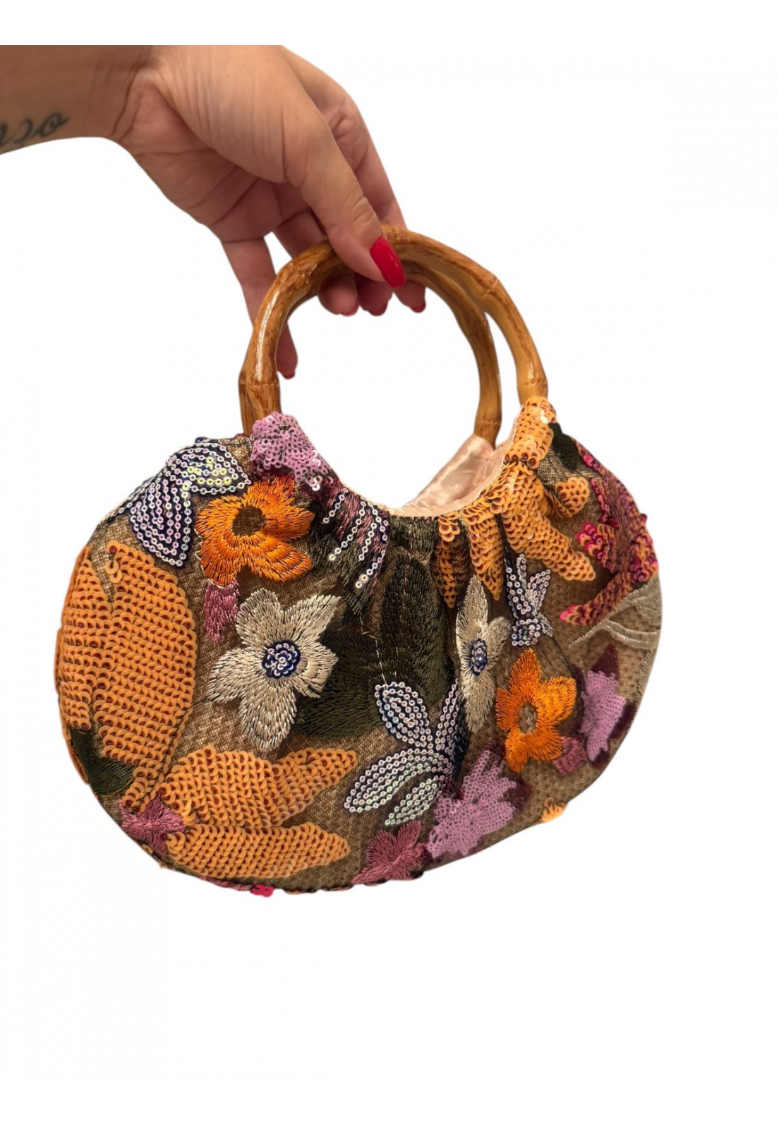 Exclusividade e Estilo Uma peça única que traduz personalidade e sofisticação em cada detalhe. Com bordados ricos em tons de laranja e aplicações de paetês delicados, essa bolsa traz um visual artístico e elegante, perfeito para quem busca sair do óbvio. O destaque fica por conta da alça rígida com efeito bambu, que adiciona um toque natural e contemporâneo, criando um contraste sofisticado com o brilho sutil dos bordados. O laço frontal em paetês valoriza ainda mais o design, tornando a peça ainda mais especial. Bordados e paetês com acabamento premium Design exclusivo e cheio de personalidade Alça com efeito bambu elegante e moderna Ideal para looks sofisticados, eventos e produções estilosas Perfeita para mulheres que amam peças únicas e querem expressar estilo com autenticidade.