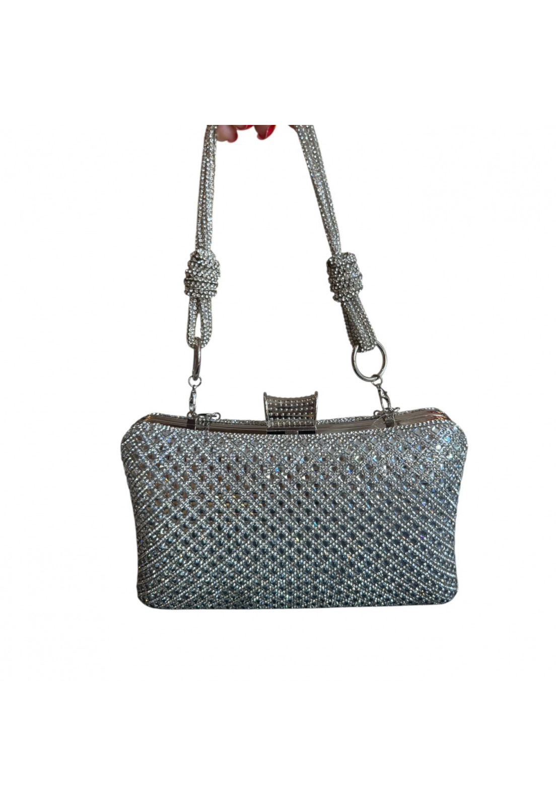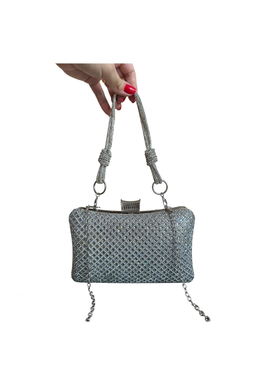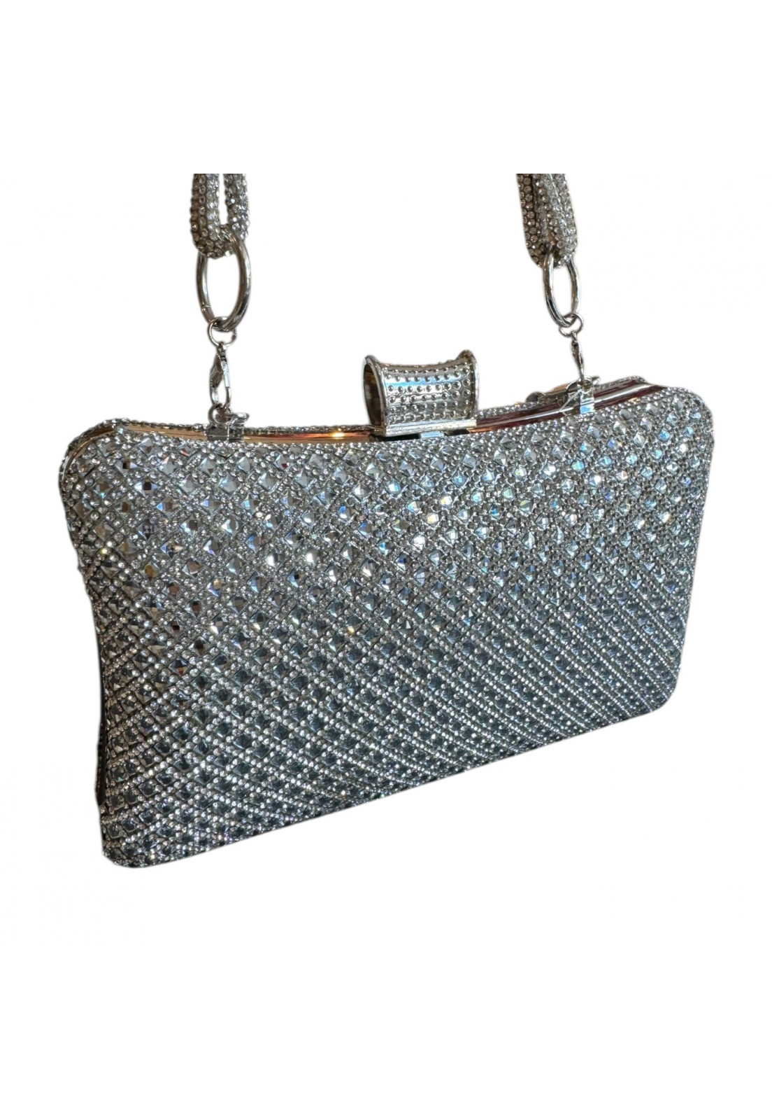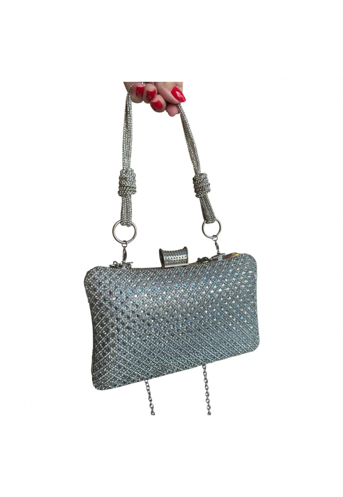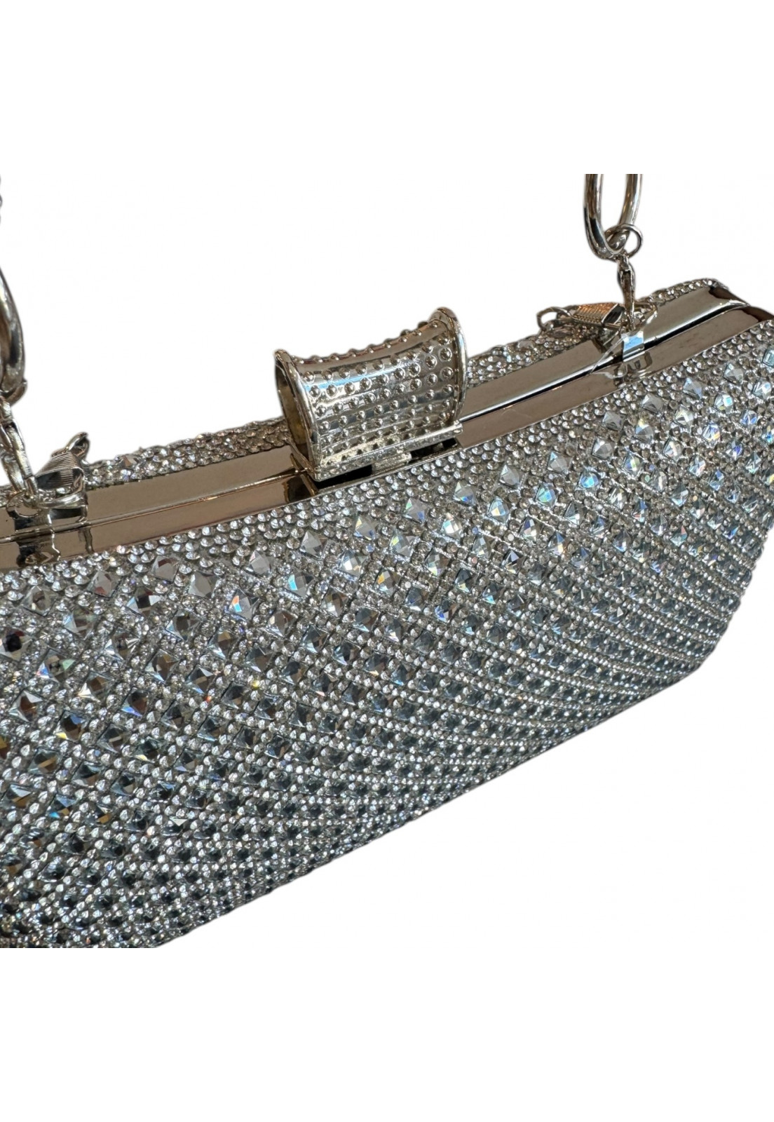 • Modelo: Clutch retangular Prata com Alça Brilho Cristal Premium