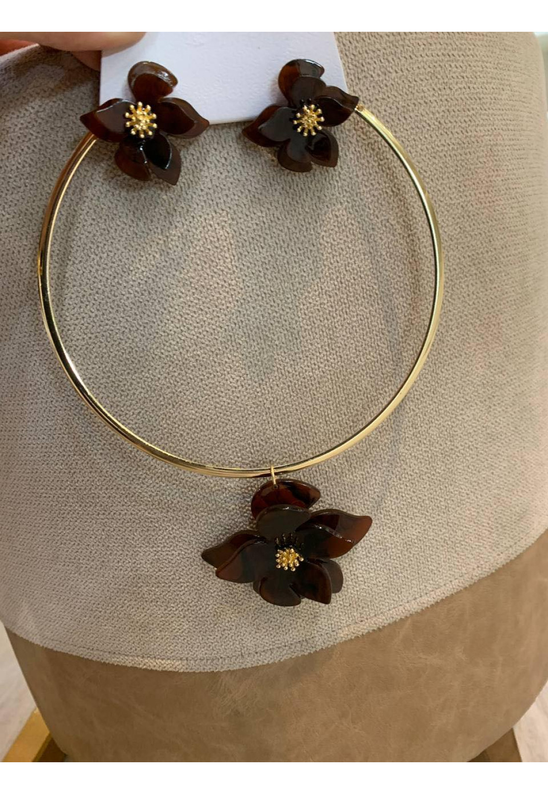 • Modelo: CONJUNTO COLAR E BRINCO DOURADO COM FLOR MARROM