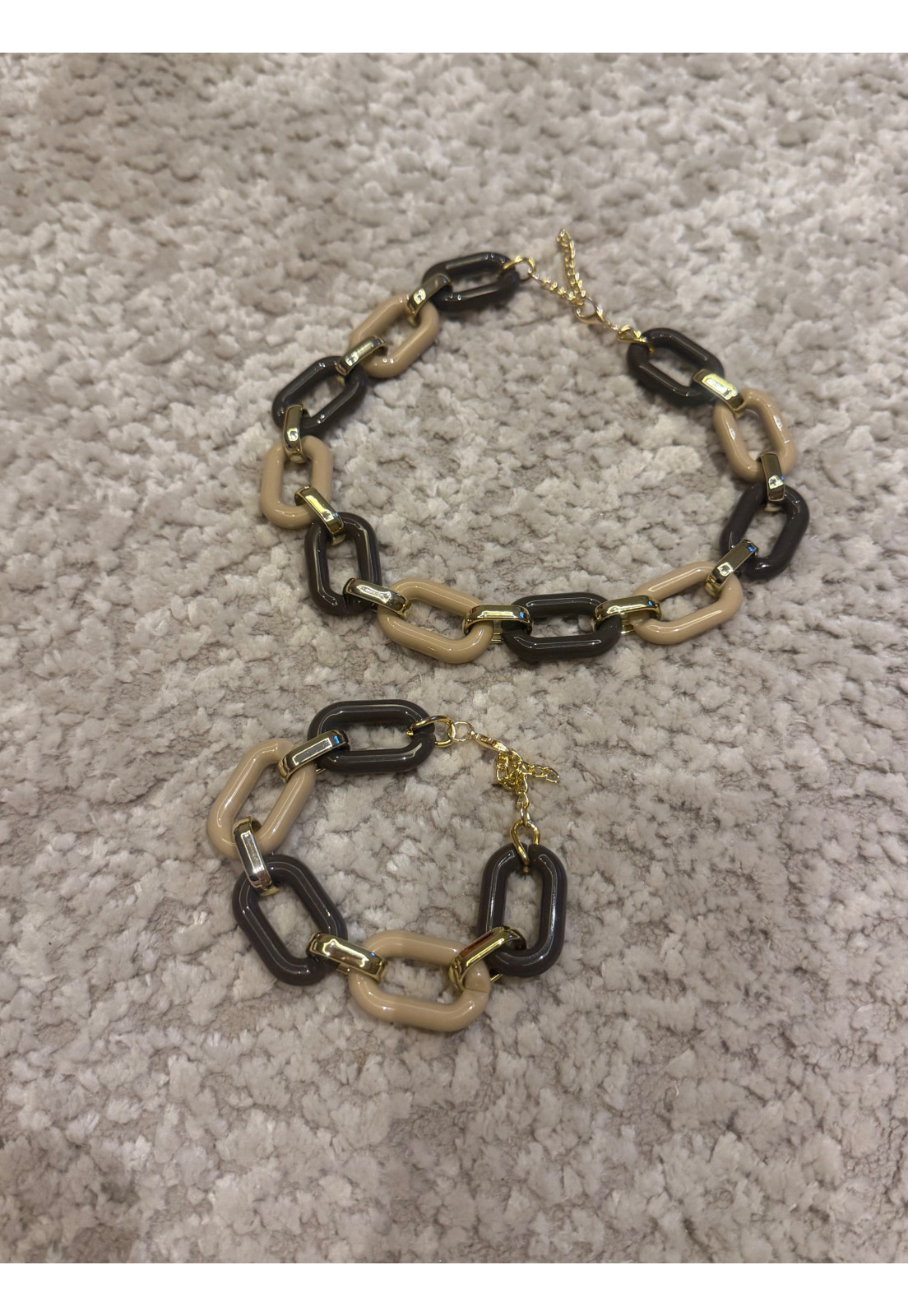 CONJUNTO COLAR E PULSEIRA CORRENTE MARROM E CREME