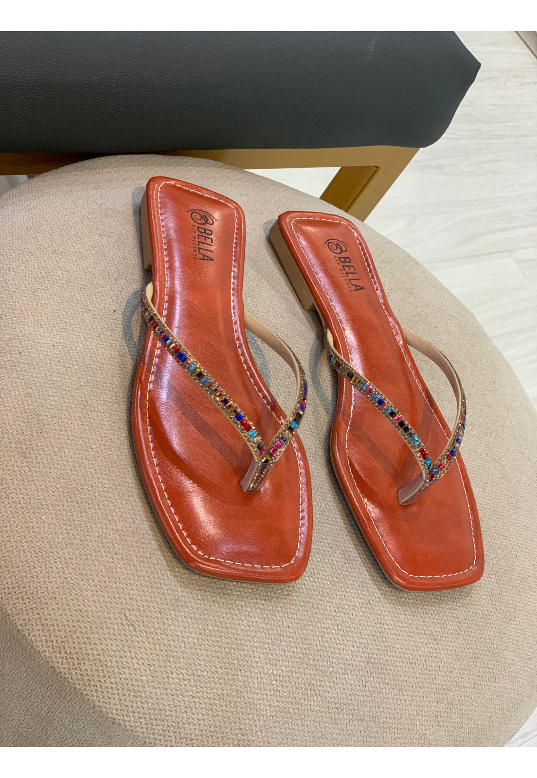 - A Flat dedo Bella Gio Rezende com tiras glitter traz uma proposta leve, moderna e cheia de personalidade.