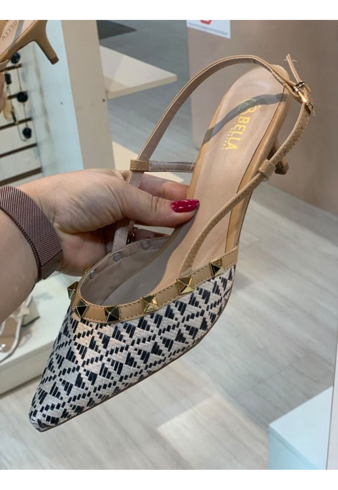 O Scarpin Nude Natural Palha Tramado com spike dourado salto 5cm é um clássico!! Uma excelente escolha para quem quer adicionar um toque de elegância e sofisticação ao look, e pode ser usado de diversas formas, desde looks mais casuais até os mais formais. Para usar, considere o seu estilo pessoal e a ocasião.