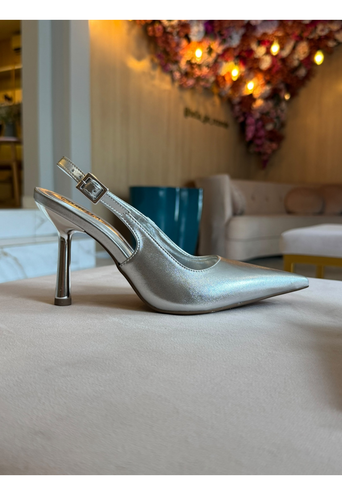 Scarpin Prata Slingback Metalizado bico fino Salto 9 cm