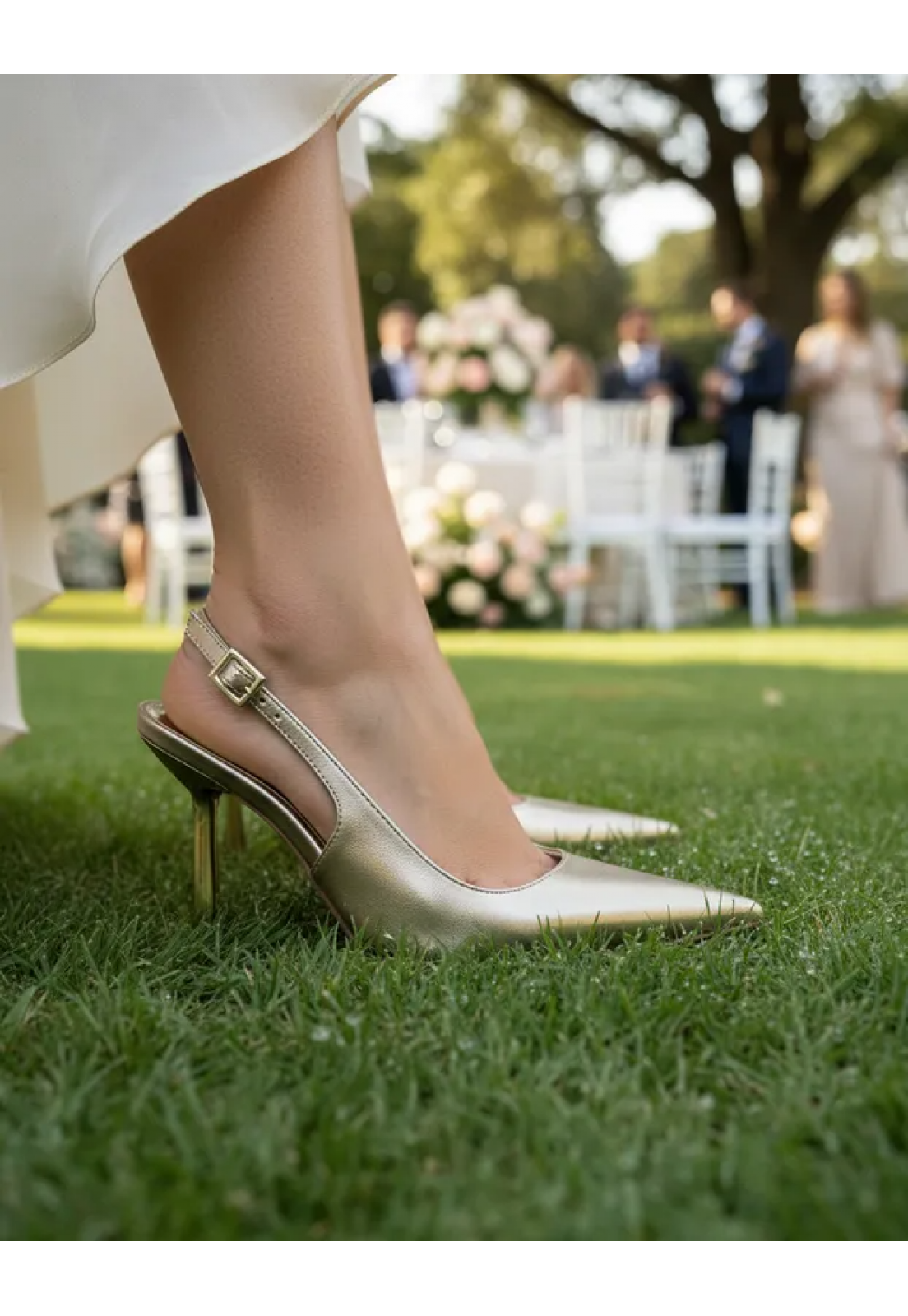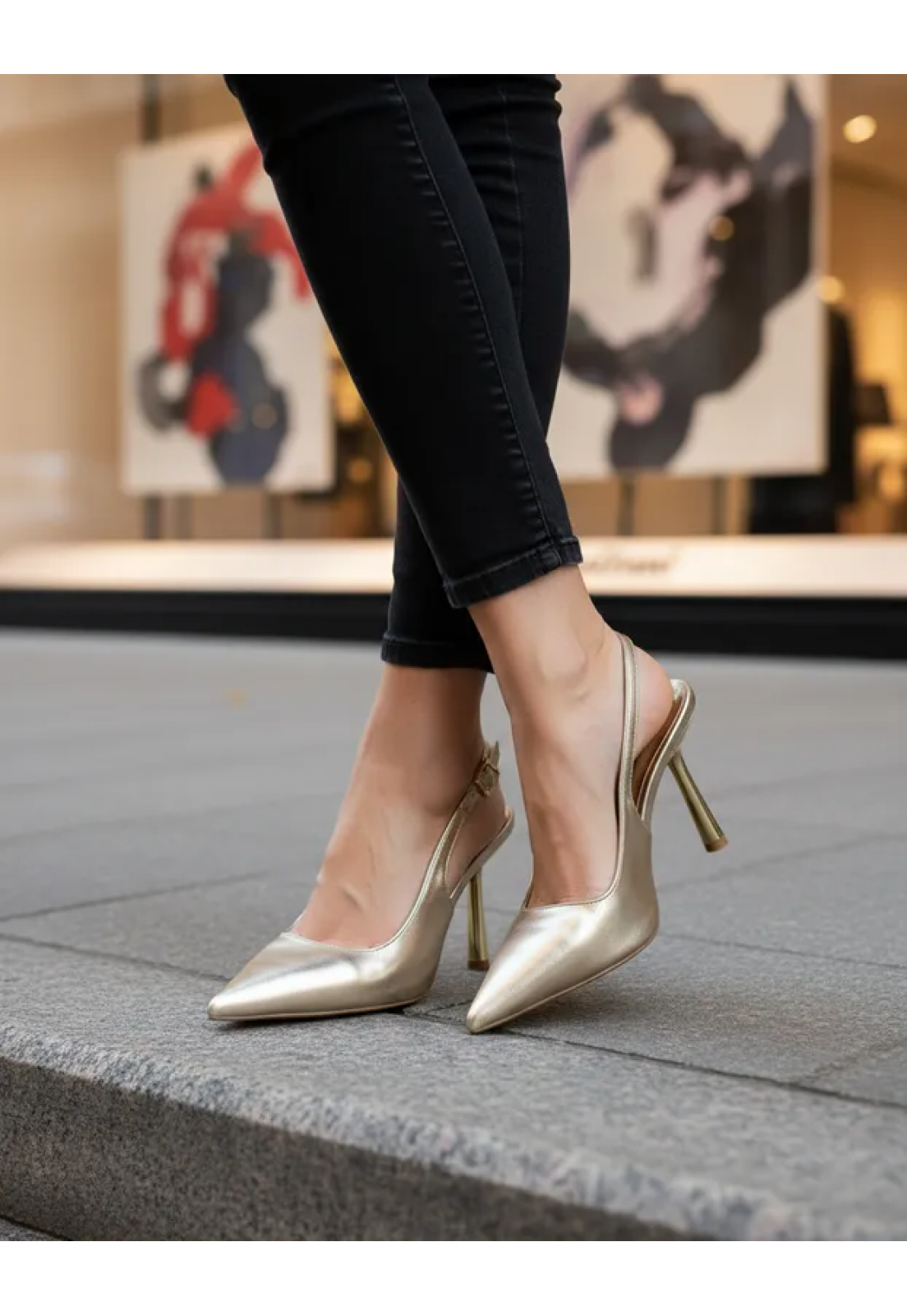 - Nosso Scarpin Slingback Dourado Metalizado Bico Fino Salto Metalizado 9 cm combina o atemporal com o moderno.