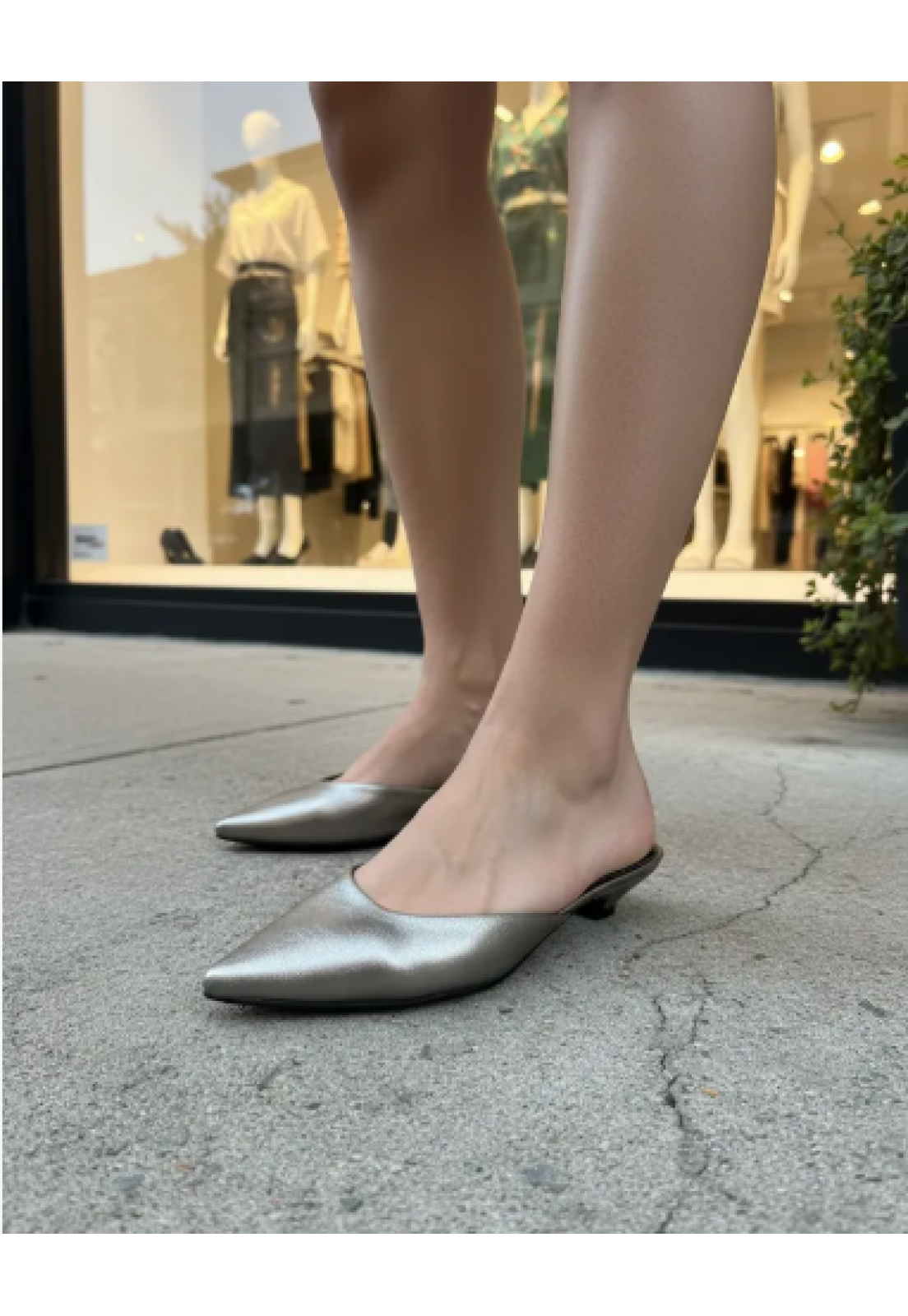 - Nosso Scarpin Mule Prata Velho bico longo Salto 2 cm combina o atemporal com o moderno.